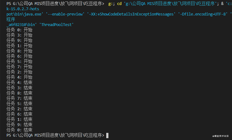 import static java.lang.System.*; /** 功能:书写一个测试类线程池的类 作者:技术大黍 */ public class ThreadPoolTest { public static void main(String[] args) { if (args.length != 2) { out.println("测试ThreadPool(线程池)任务."); out.println( "使用方法: java ThreadPoolTest 任务数 线程数"); out.println( " 任务数 - integer: 表示需要执行的任务数量."); out.println( " 线程数 - integer: 表示在线程池中的线程的数量 "); return; } //读取命令行参数任务数值和线程数值 int numTasks = Integer.parseInt(args[0]); int numThreads = Integer.parseInt(args[1]); //创建线程池对象 ThreadPool threadPool = new ThreadPool(numThreads); //执行示例任务 for (int i = 0; i return new Runnable() { public void run() { out.println("任务 " + taskID + ": 开始"); //模拟长时间执行任务 try { Thread.sleep(500); }catch (InterruptedException ex) { ex.printStackTrace(); } out.println("任务 " + taskID + ": 结束"); } }; } }运行效果