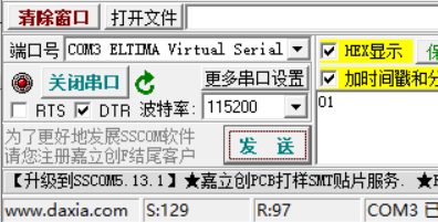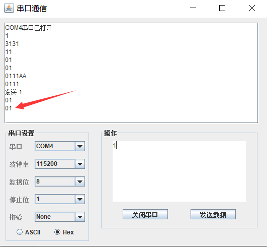 相应的,现在选择ASCII,接受到了一个字节 byte 的值是49,则对应就是字母1,就是把每个字节转化为对应的ASCII码。那么如果是十六进制的话,使用另一个调试助手发送16进制 01