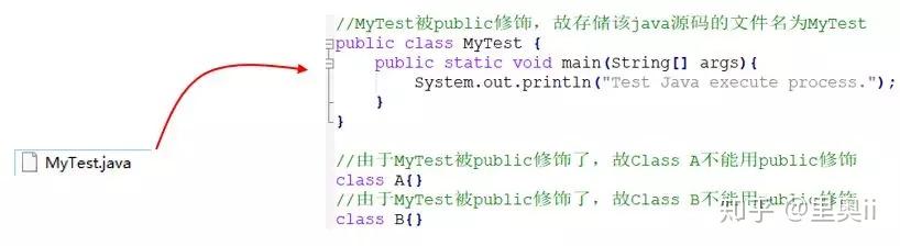 //MyTest被public修饰,故存储该java源码的文件名为MyTest public class MyTest { public static void main(String[] args){ System.out.println("Test Java execute process."); } } //由于MyTest被public修饰了,故Class A不能用public修饰 class A{} //由于MyTest被public修饰了,故Class B不能用public修饰 class B{}1、java源文件名就是该源文件中public类的名称