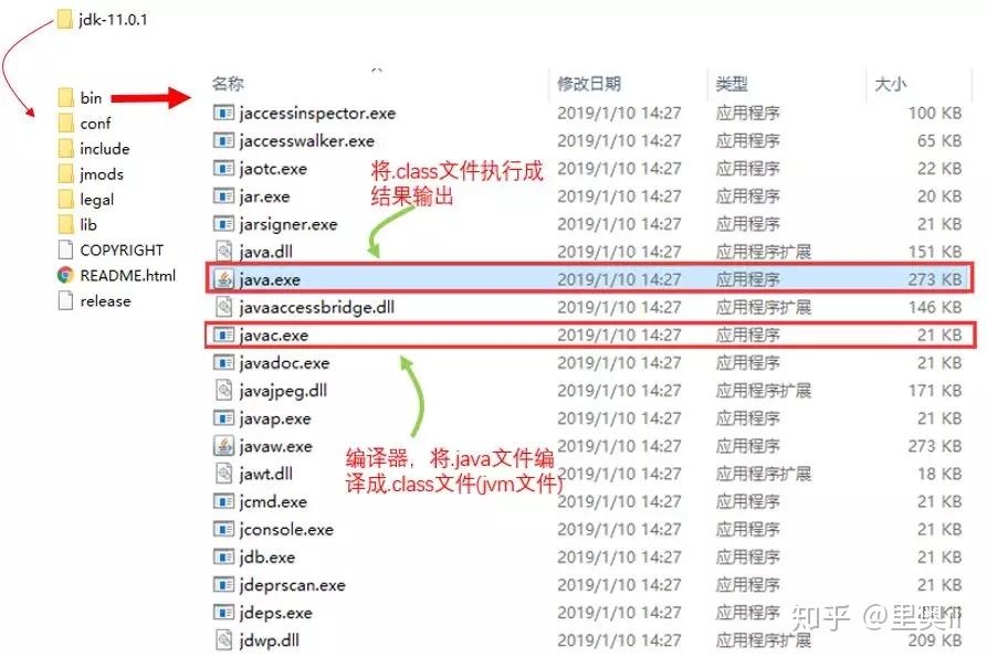 安装好jdk后,我们打开jdk目录,有两个.exe文件,即javac.exe(编译源代码,xxx.java文件) 和 java.exe(执行字节码,xxx.class文件).