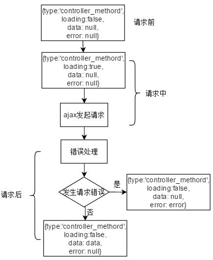 上述所说的入口文件index.js用来装饰每一个controller,装饰的内容就是遍历controller文件的actions对象,生成actions函数和reducers纯函数。最后将生成的reducers交给redux管理,actions则为组件提供调用。actions函数里面有三步,包括请求前,请求中和请求后对状态的处理。这三步是为了设置接口请求的loading状态,通过loading状态来处理页面的加载效果,省去在组件中自定义的逻辑判断。下图为每个接口在action函数的数据处理。