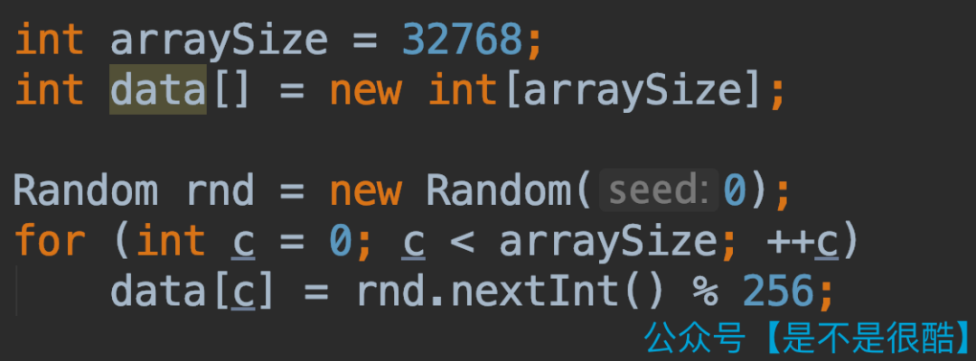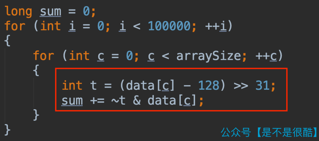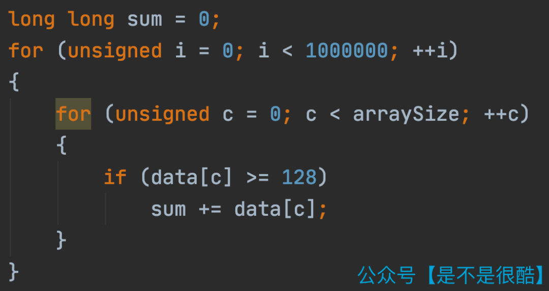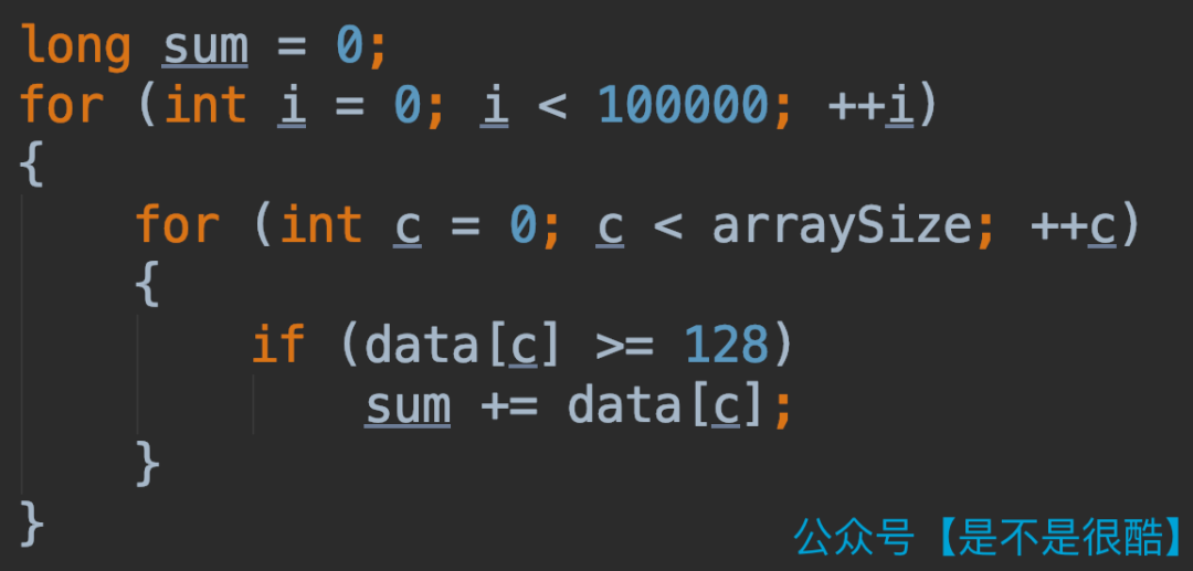 相信大家都能看懂。这段代码对 data 数组中所有大于等于 128 的值进行求和。这样的求和操作运行了 10 万轮。