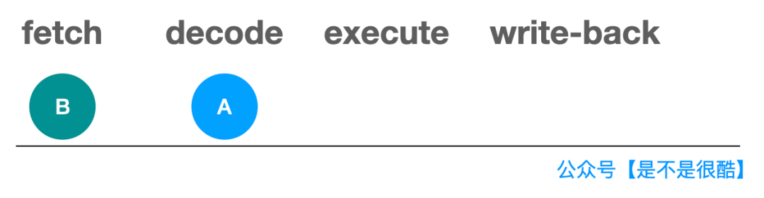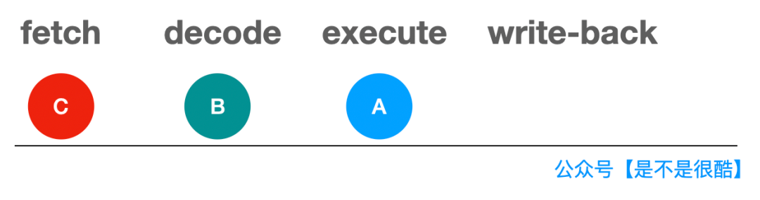 当 A 指令 decode 完成,进入 execute 阶段,就可以开始对 B 指令进行 decode 了,同时,B 指令的下一条 C 指令,就可以开始 fetch 了。▼