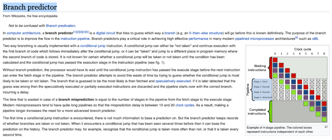 关于分支预测,有兴趣的同学,可以参考维基百科的 Branch predictor 词条,了解更多。