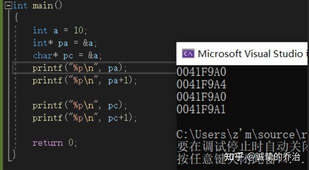 从图上就可以看到,当指针变量的类型是int型时,指针变量加一,地址就变了四个字节的,当指针是char类型的时候,指针变量加一就变成跳过一个字节的单位了。