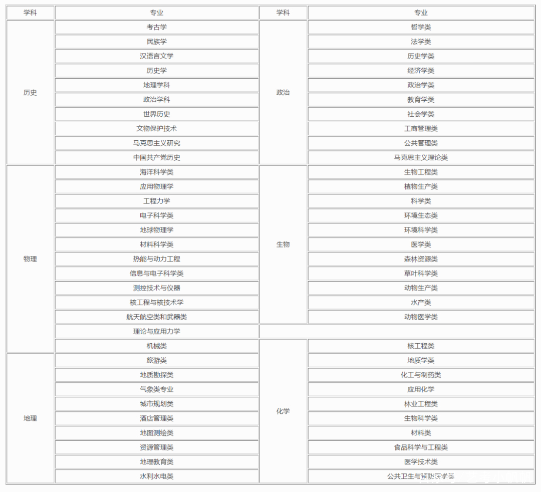 以上就是各选科科目对应的相关专业。但需要大家注意的是,因培养目标的不同,相同专业在不同的院校可能会有不同的选科要求,如山西大学的考古学专业要求地理和历史2选2,而北京大学考古学专业无限制,郑州大学考古学专业要求选择历史;大连理工大学的工程力学专业不限制选科,而东南大学的工程力学专业要求物理化学2选2等。