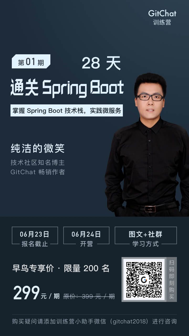 尤其是 Spring Boot 2.0 的推出,又激起了一阵学习 Spring Boot 的热潮,为了让所有工程师能用好这个实用的框架,掌握微服务开始的基础,我联合 GitChat 一起组建了 “28 天通关 Spring Boot 训练营”,现在 01 期训练营正在招生中。接着讲讲我为什么要开这个 Spring Boot 训练营。