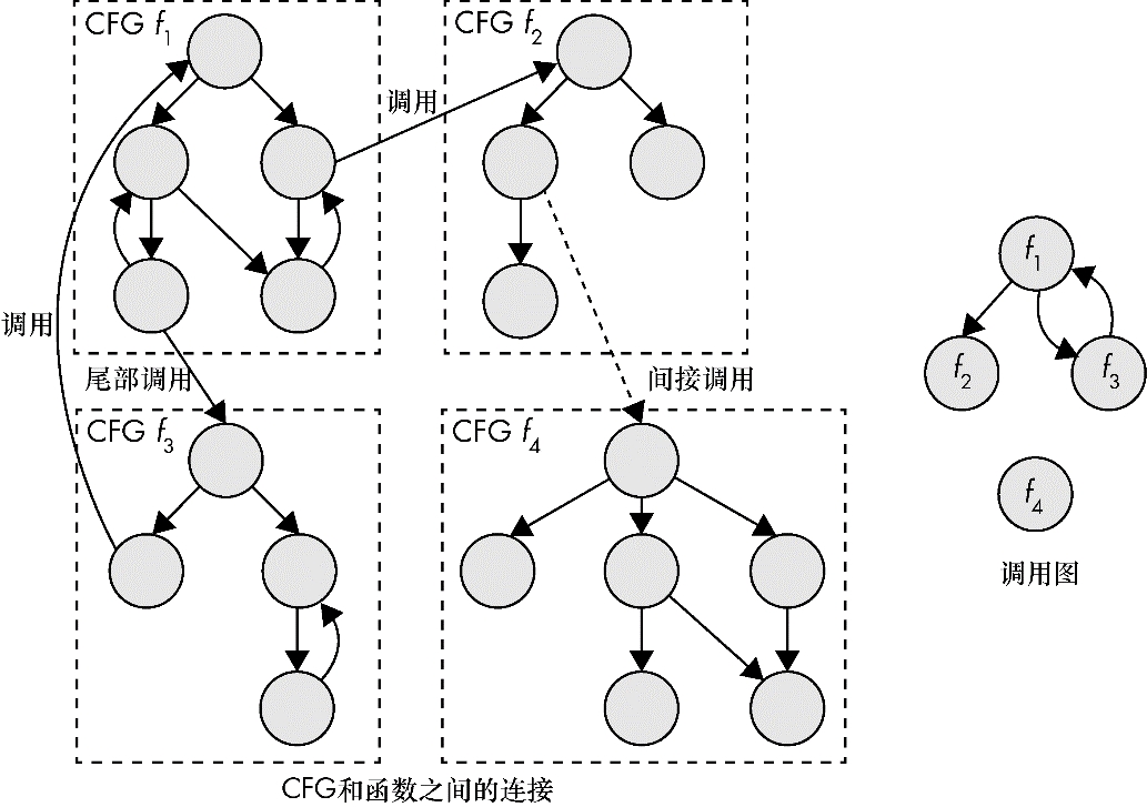 实际上,反汇编工具通常会从CFG中忽略间接调用,因为很难静态地解决此类调用的潜在目标。反汇编工具甚至还会定义全局CFG,而不是按每个函数定义CFG,这样的全局CFG称为过程间CFG(ICFG),因为实质上它是所有函数CFG的并集(过程是函数的另一种说法)。ICFG避免了易于出错的函数检测的需要,但其没有提供每个函数CFG所拥有的分隔优势。