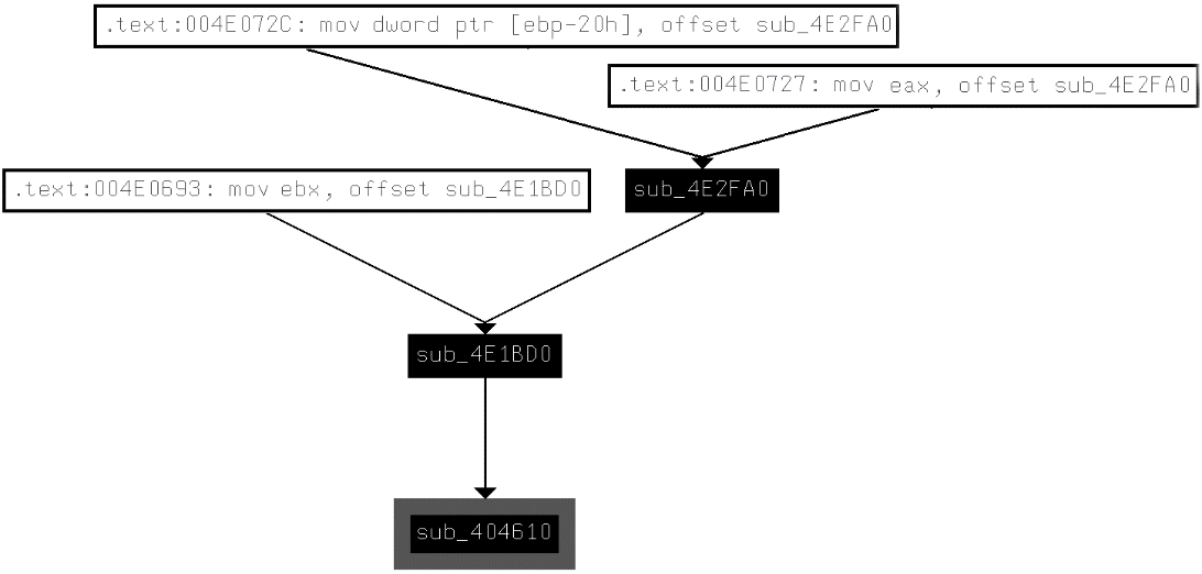 另外,IDA Pro中部分调用图显示了将函数地址存储在某处的指令。如在.text节的地址0x4E072C处,有一条指令将函数sub_4E2FA0的地址存储在内存中,称为获取sub_4E2FA0函数的地址,而这个地址在代码中任意位置的函数称为地址获取函数(address-taken function)。