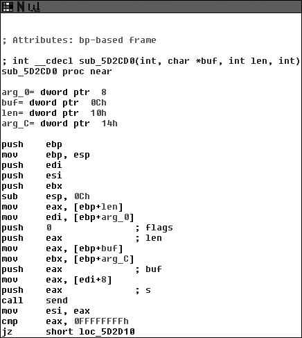 在基本块底部附近,有一个通过网络发送消息的已知函数调用。因为IDA Pro知道send函数的参数,所以它可以标记参数名称(flags、len、buf、s),并且推断出用来加载参数的寄存器和内存对象的数据类型。
