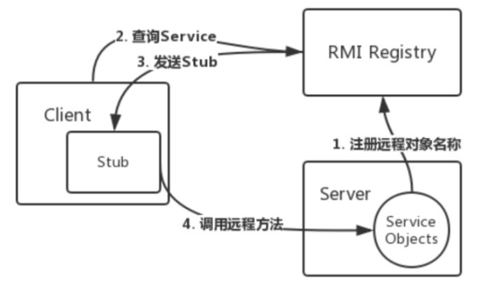 然后当客户端希望拿到某个服务例如订单服务order的stub对象时,就用”order“这个名字到RMI注册中心上去请求这个stub