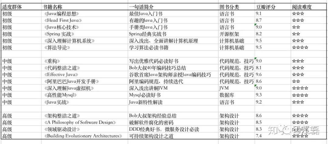 1.图书列表按照初级、中级、高级进行了大致区分,初级是指刚入门Java的同学或者开发经验很少的初级工程师;中级是有一定开发经验,但还没有独立设计过大型项目的工程师;高级是指由大型项目设计经验,并且有一定项目架构、管理经验的工程师。但推荐书目只是大致进行了区分,区分了书籍最适应的人群。初级的同学可以阅读中高级的推荐书目,只是有些读起来会有些吃力