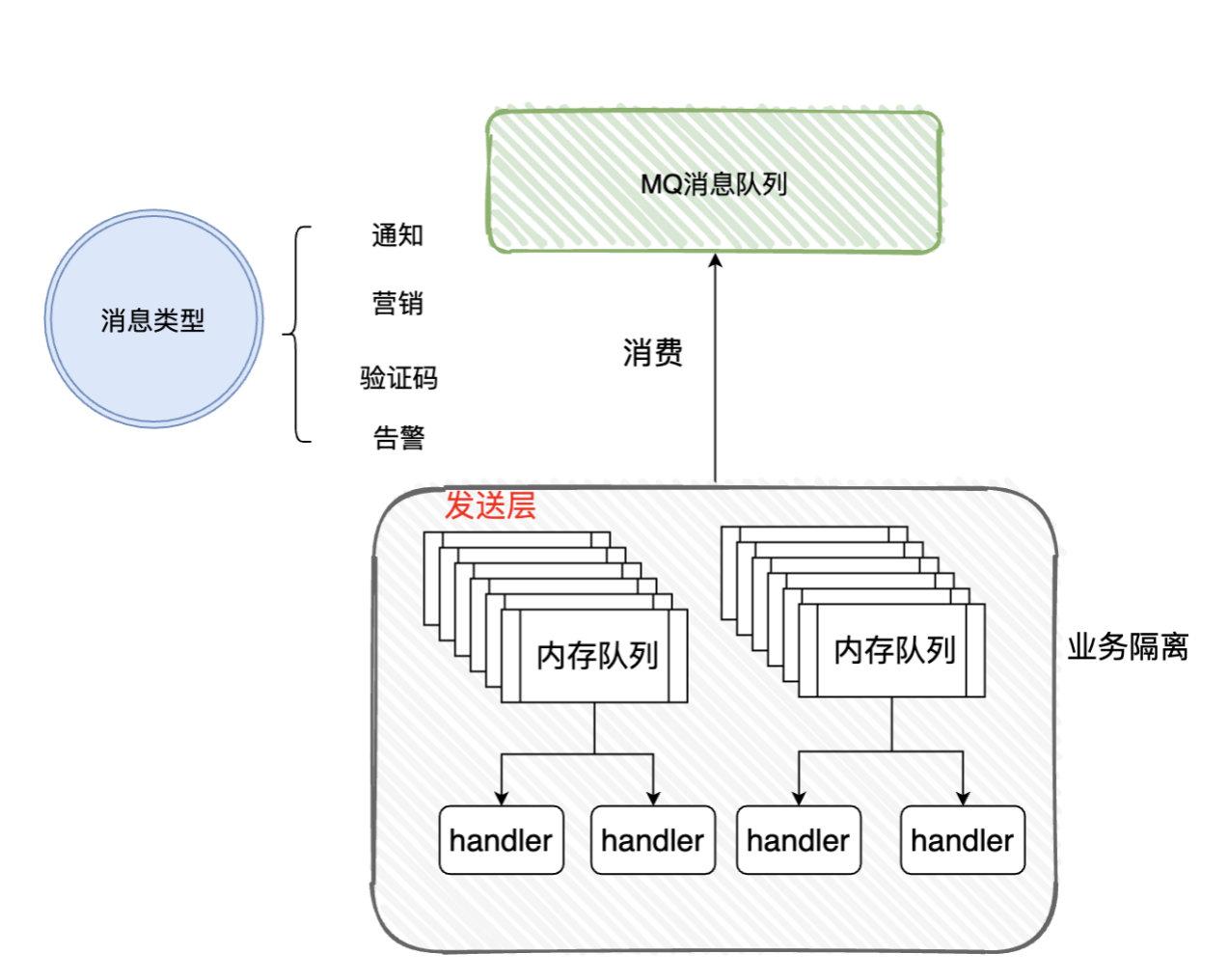 发到消息队列时,会根据不同的消息类型发到不同的topic上,发送层监听topic进行消费就好了。架构大致如下: