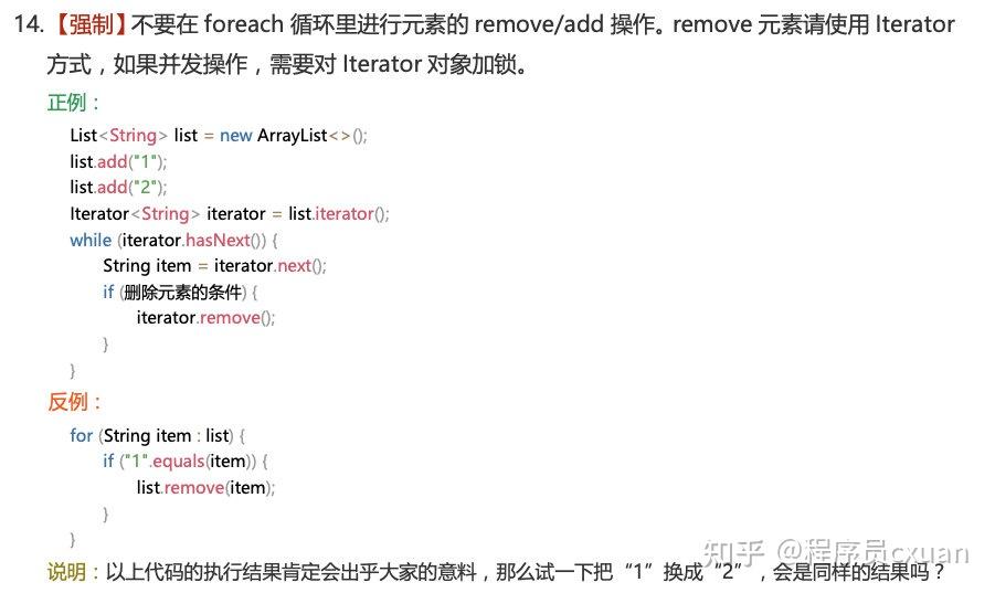 在阿里开发规范上,也有不要在 for-each 循环内对元素进行 remove/add 操作的说明。