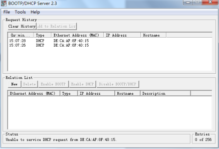 起初,上位机PC使用dhcpwiz这个软件配置成DHCP服务端,但后来发现一个弊端,无法保存和指定IP,导致一段时间后重连或者换了台电脑后,整个得到的下位机IP清单又会被重新配置,每次都不一定一样。所以便又在网上找,最终找到了另一个非常好用的软件BOOTP-DHCP Server 2.3.2 Standalone。界面更加友好,也能指定IP和保存之前配置过的设备信息。但无论哪个软件,都要记得在配置DHCP之前将PC自身连接的网络断掉,并将电脑IP地址那里设置成与即将设置的DHCP同一网段。