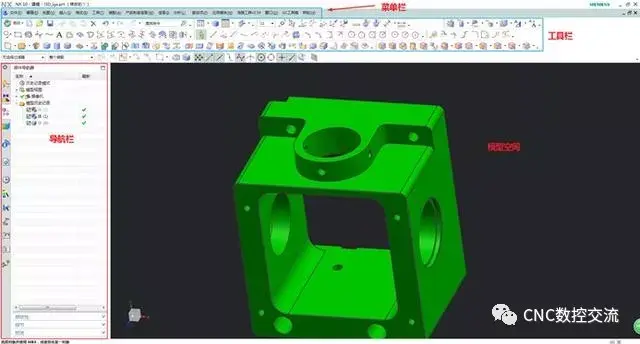 UG界面,主要分为四大部分:菜单栏,工具栏,导航栏,模型空间