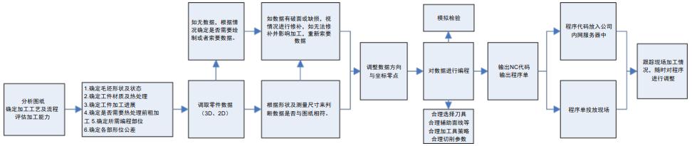 根据分析图纸了解工艺流程来判断哪些加工部位是需要由加工中心设备来完成的,哪些部位是由其他部门加工设备完成的。在本公司,不是所有程序都是有编程员来完成,一般简单形状、孔加工或 2D 程序由现场操作人员现场编制, 3D 形状、程序复杂或有特殊要求的程序由编程人员来编制。具体情况具体分析,但总体要以缩短制造周期,提高质量,减少加工误差及返工作为第一守则进行判断。