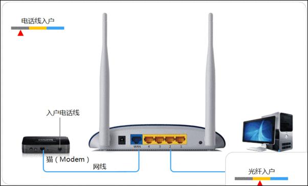 (1)猫连接电话线和路由器/电脑;如下图:
