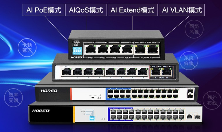 当电脑连接数量超过路由器接口(也就是企业网、局域网等网络建设)时,需同时选择路由器和交换机,以hored交换机为例,有五种模式,千兆4-24口,支持POE供电,完全满足用户需求。