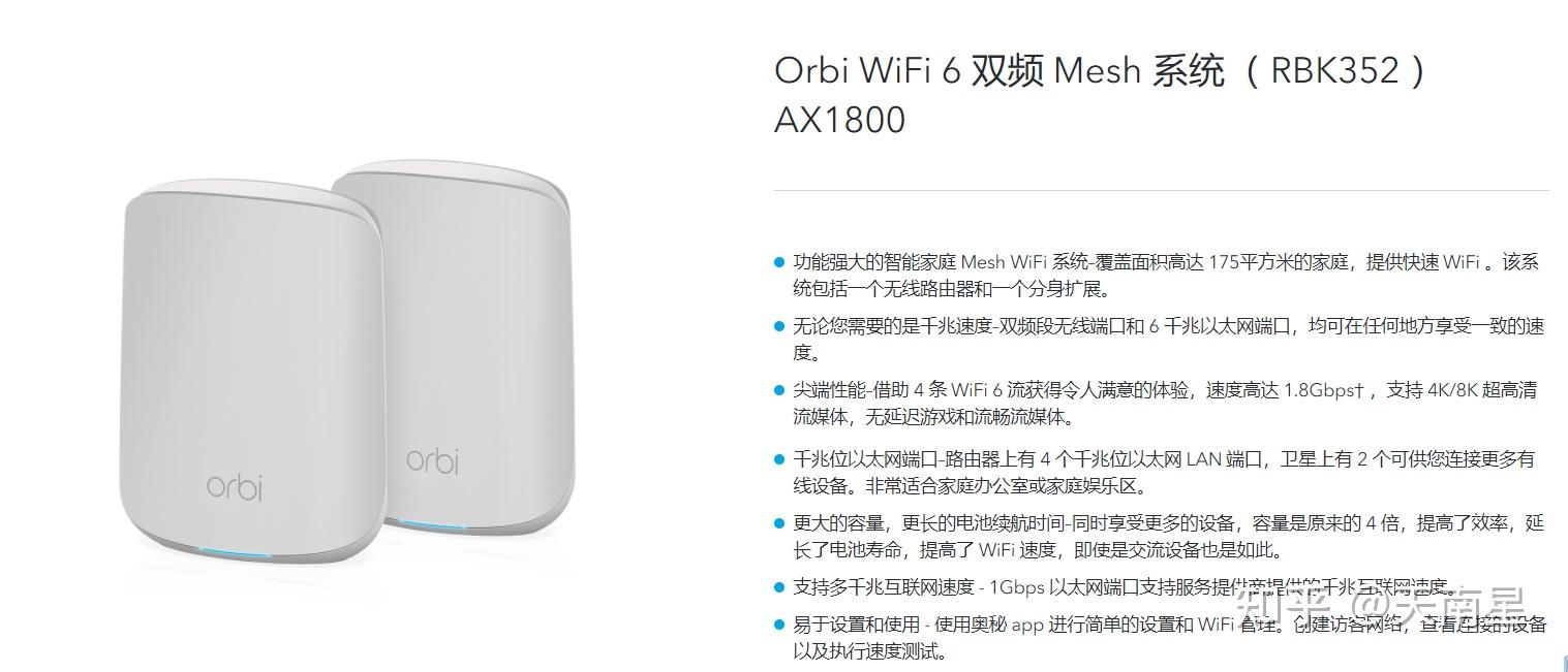 领势E7350技术参数(2)、2021年新品,美国网件(NETGEAR)RBK352 AX3600M WiFi6 Mesh高速路由器 两支装,高通芯片方案。