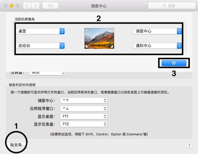 Messages 远程控制3.在屏幕四角开启触发角功能。系统偏好设置->调度中心->触发角。鼠标箭头一触屏幕角落的其中一角便能启动所指派的功能。