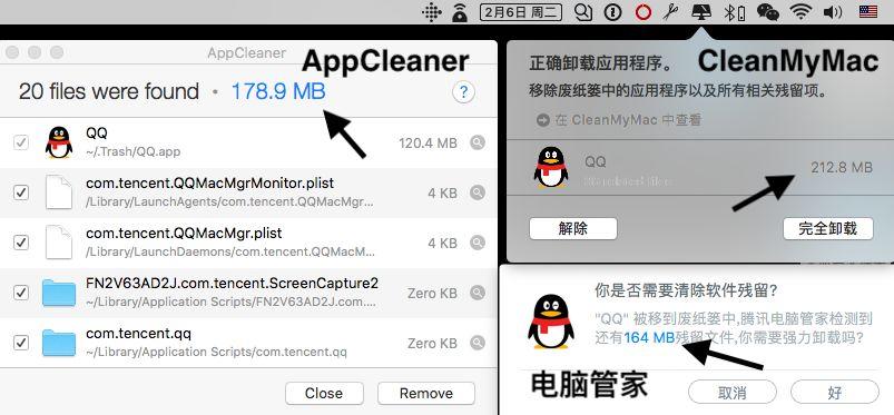 直接把QQ图标拉入废纸篓只删120MB、用AppCleaner删178.9MB、腾讯电脑管家164MB、而CleanMyMac是212.8MB!