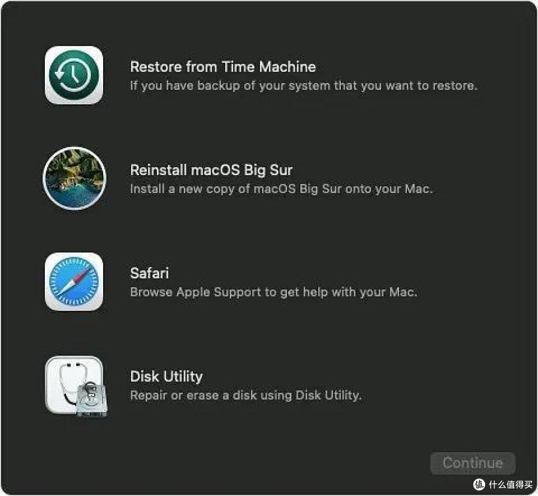 4、此时进入到恢复模式,可以进行恢复时光机备份、重新安装系统、格式化磁盘等其他操作。