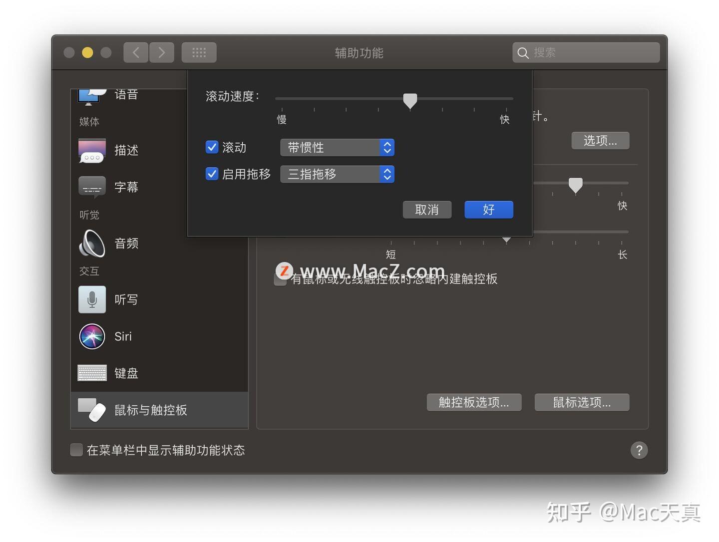 光标与点按滚动缩放更多手势推荐将 光标与点按 > 轻点来点按 的选项勾选,这样就不用每次都用力地按压触控板来点击了。你还可以在这里设置符合自己使用习惯的光标移动速度,一般我是将跟踪速度设置为 “最快”。