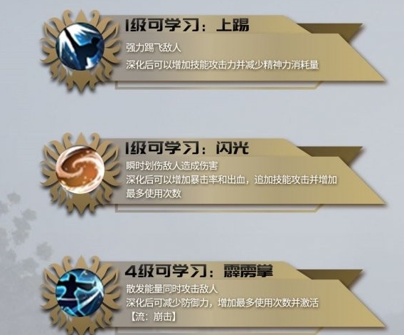 上踢:强力踢飞敌人,打击伤害125%,打击成功时击飞。消耗精神力15,冷却时间5秒。