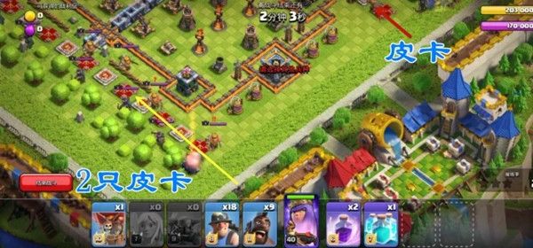 6点钟方向只放两个“皮卡”有点攻击力不足,所以在“矿工”一字划的时候要往“皮卡”的方向“画两个矿工”而接下来的“野猪骑士”一字划就不用了,我们尽量往阵型里面投放,让野猪快速地接近敌方的防御建筑。