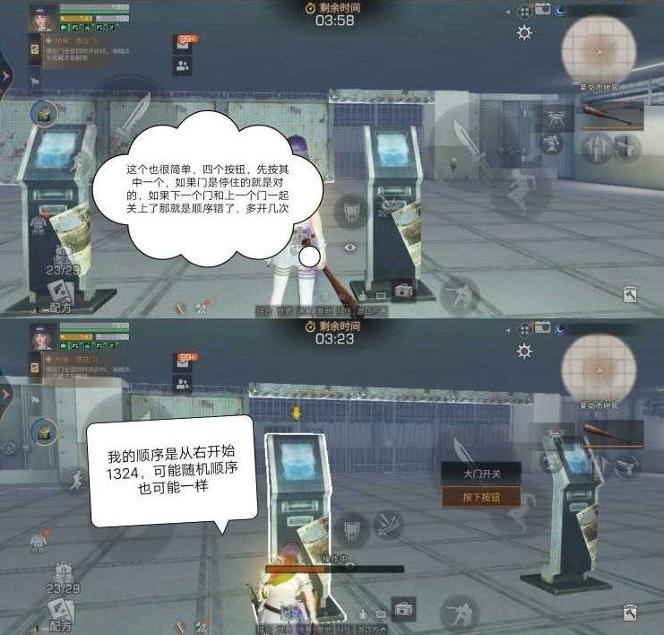 进门之后会有4个大门开关,需要正确的开门顺序才能全部开启,不过每个人的密码是不同的,所以没有固定答案,只能一个个试,对了会开一扇门,错了会重新刷新,用排除法就行。