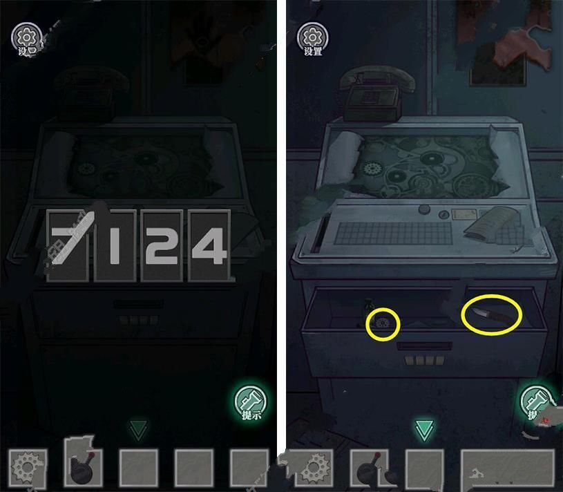 34. 输入密码【7124】,打开抽屉,拾取【齿轮】和【小刀】。