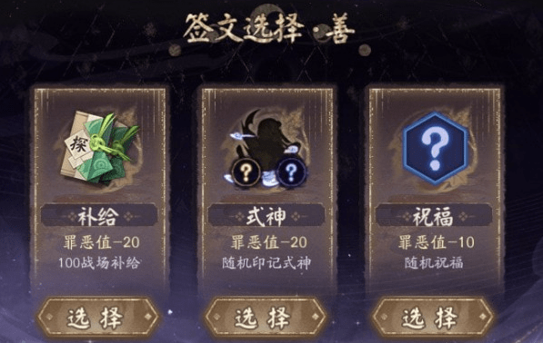 2、如果遇到奇遇事件,签文出现了善签,那么就选择【补给】或者【式神】这两个罪恶值都减少的多一些。