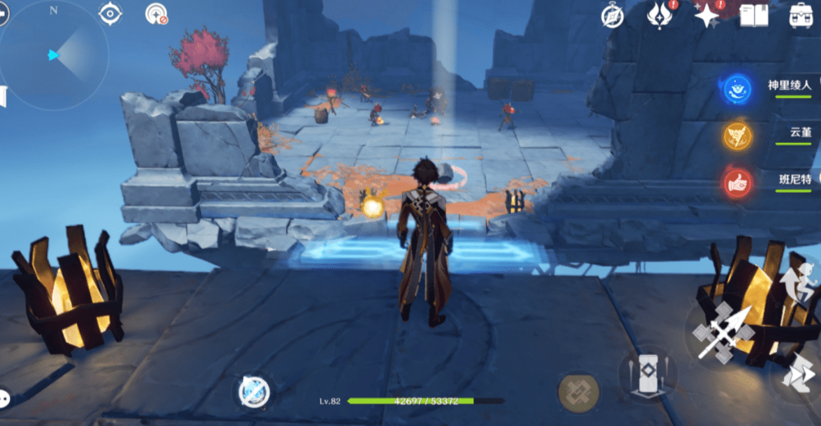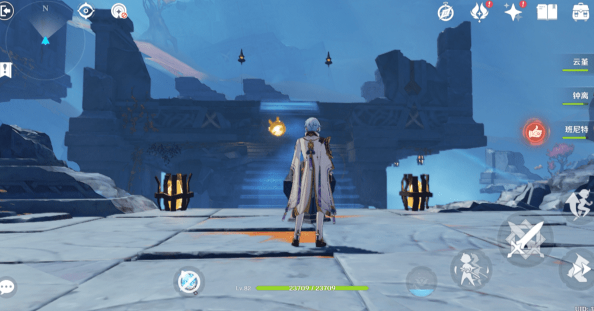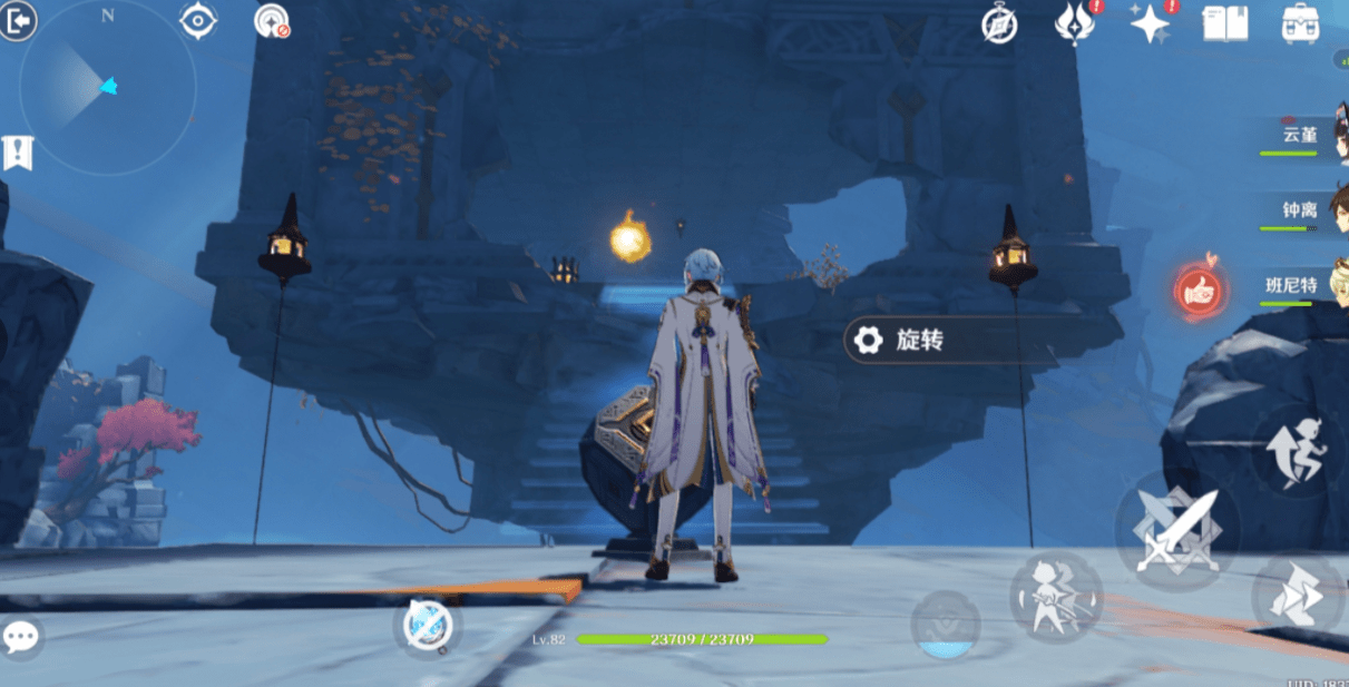 1.进入秘境后,把视角转到右边,可以看到一个机关转一下,如下图会出现浮现的桥往前走