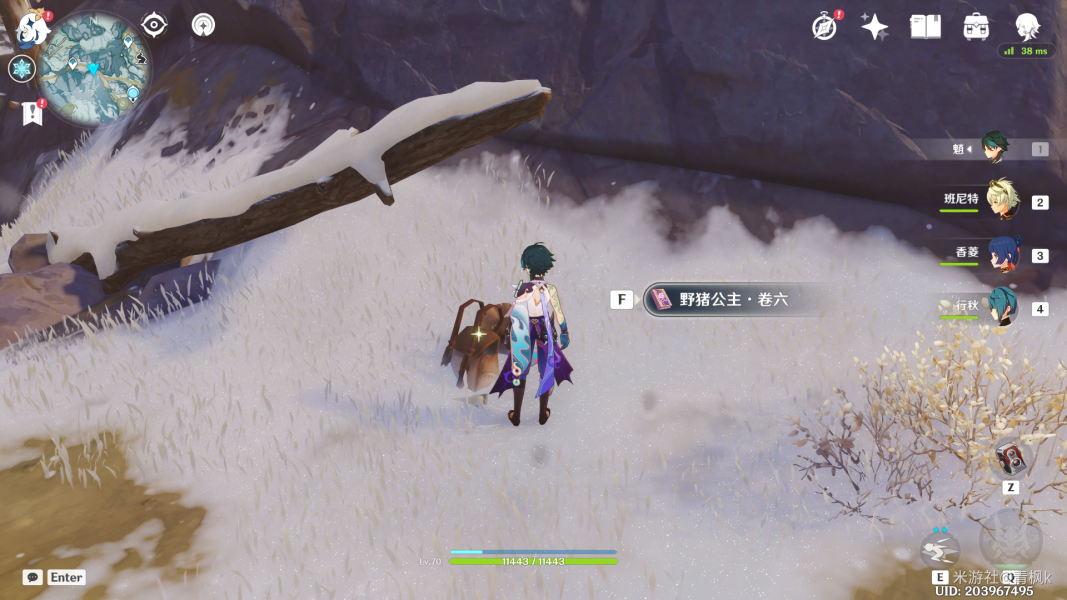 在完成雪山的前置任务〔雪山迷踪〕后,在图中标记处有一个调查点可以拿到《野猪公主·第六卷》