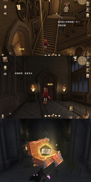 1:第一个就是城堡主楼这里了,在图书馆上方楼梯到达走廊之后然后我们进入走廊拐弯,然后我们一直走到底,进入盥洗室,然后我们触发剧情,接着我们就会获得图书馆卷一张的奖励了;