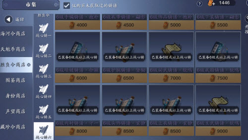 4、胜负令及战心铸:120级可以兑换6级上衣和主武器战心铸,需要8500+9000=17500点胜负令。下周4品/5品自选战心铸可以留着等升级后再用,武器和上衣都是战心铸加的比较多的部位。