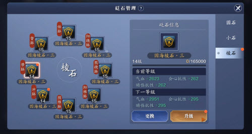 3、砭石部分:120级普升需要290个绿色石母。另外开放8个棱石14升到15级,一个砭石升级需要16.5W经验需要1.65组绿色石母,8个棱石加上普升共需13.5组绿色石母。