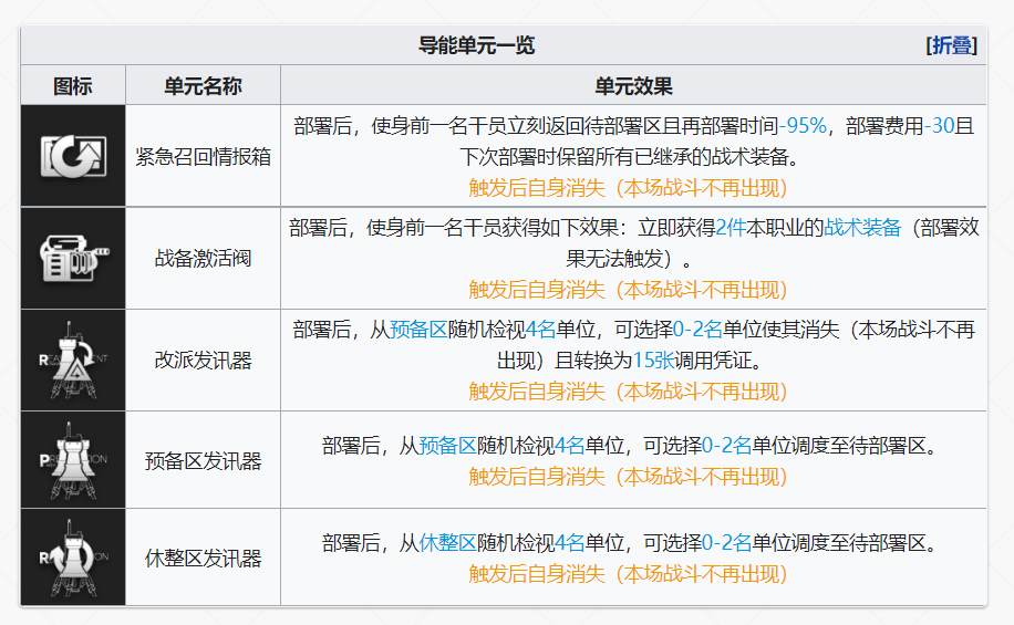 部署后,使身前一名干员获得如下效果:立即获得2件本职业的战术装备(部署效果无法触发)。
