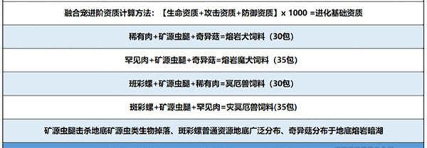 饲料:新宠物需要熔岩魔犬35包饲料和焰岩犬30包饲料,可能后面是冥厄兽30包饲料和灾厄冥兽35包饲料。材料:矿源虫腿,稀有肉,奇异菇,斑彩螺,罕见肉。
