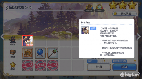 物理大BOSS赋予了法伤技能,虽然说的是低等魔法伤害,还是轻轻松松打上千伤害,太怕痛,建议继续带黄骑。首先开荒2-3次熟悉一下BOSS释放技能的时机,所谓观察抬手动作,预判实际,然后卡在BOSS技能释放前,提前开启黄骑的魔免盾。同时本关最好有一个3星输出角色,比如单体暴击弓,能对BOSS造成提成顿伤害。(另外不知道是我错觉,还是本关有个小BUG,明明我方队员还在跑图,BOSS就先手给我前排来了一巴掌=。=?)