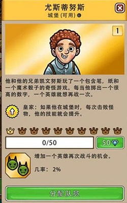 6、最后一个就适合后期的老铁们啦,开启你们的小城堡,拥有尤斯蒂努斯队员,将他放置在城堡内,他的特殊技能就是增加一个英雄再次战斗的机会。