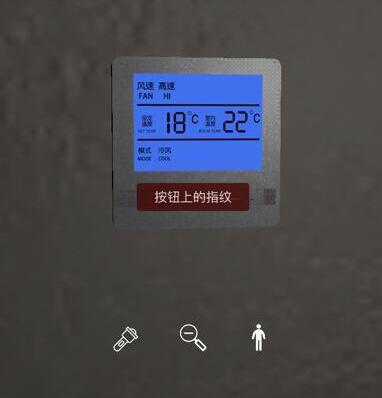 按钮上的指纹这个线索在休息区墙上的空调开关上面可以找到,不过需要使用放大镜。