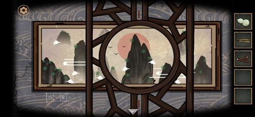 4、来到日出的画作前,把镂空屏风间对齐红色中线。根据左下角的提示,按顺序数出圆圈内。即左边书柜下的柜子密码为:2381,获得④榔头。