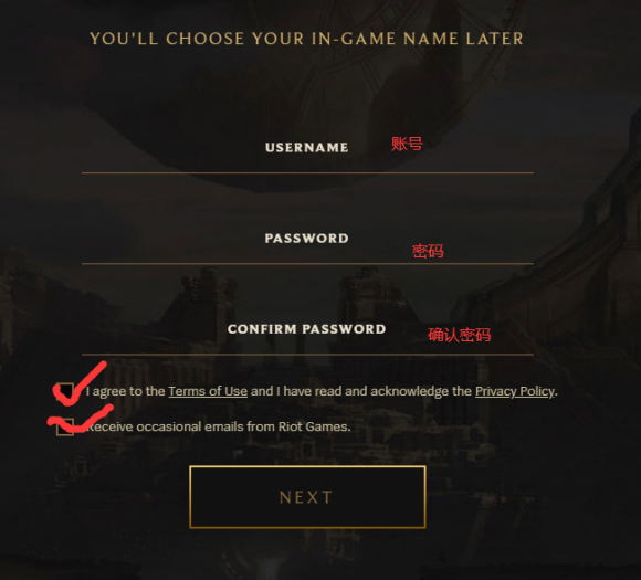 4、输入玩家需要创建的账号 想要设置的密码 并且够定相对应的选项后,点击NEXT