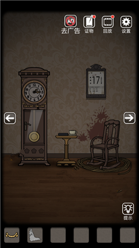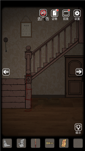 7、回到楼梯场景,用刀划开绳子,捡起符纸,打开大厅的灯,拿到鸡尾酒的配方。