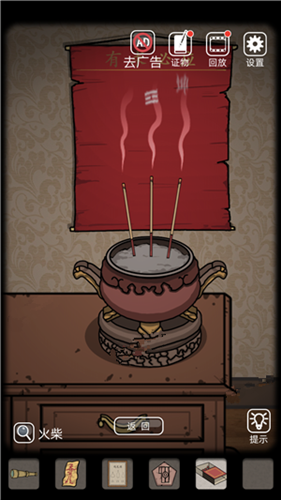 11、点击右边的香炉,插上三根香,用火柴点燃,得到线索风、坤(对齐这两个再试中间的)。