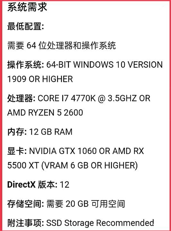 显卡:NVIDIA GTX 1060 OR AMD RX 5500 XT (VRAM 6 GB OR HIGHER)