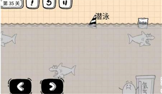 2、接着需要潜到水里,并往左边一动,来到最右边鲨鱼最少的位置。