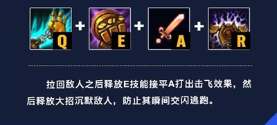 2、q技能勾中之后使用e技能平a击飞拉过来的敌人,再落地前再接大招沉默,控制打足。